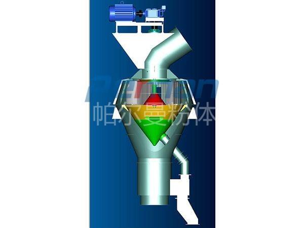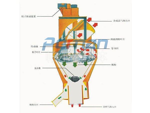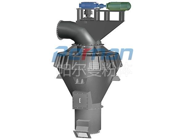 氣流分級機(jī)與旋風(fēng)分離器、除塵器、引風(fēng)機(jī)組成一套分級系統(tǒng)。物料在風(fēng)機(jī)抽力作用下由分級機(jī)下端入料口隨上升氣流高速運動至分級區(qū),在高速旋轉(zhuǎn)的分級渦輪產(chǎn)生的強(qiáng)大離心力作用下